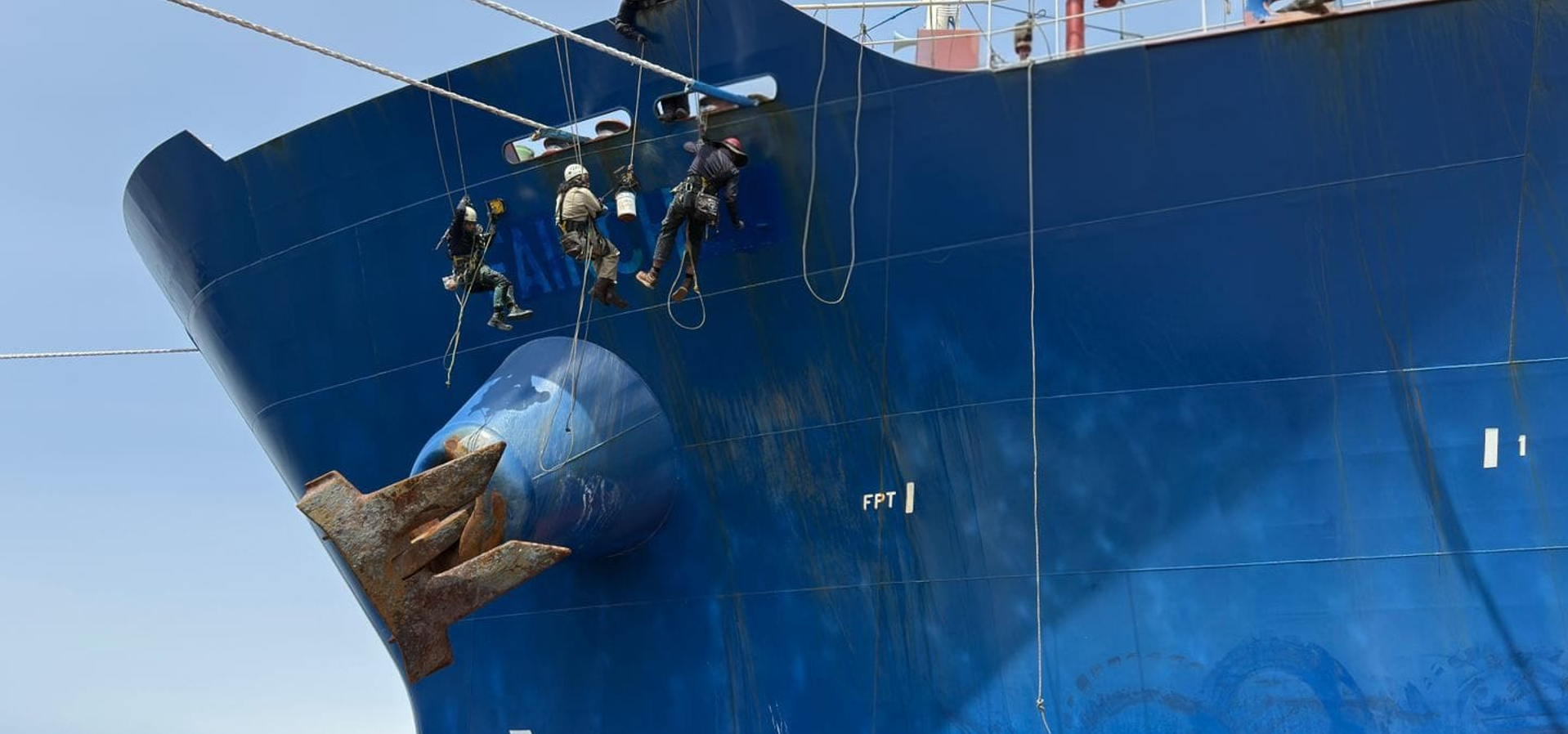 Painting jobs - Ship name, funnel, logo flag: with the use of rope access technicians